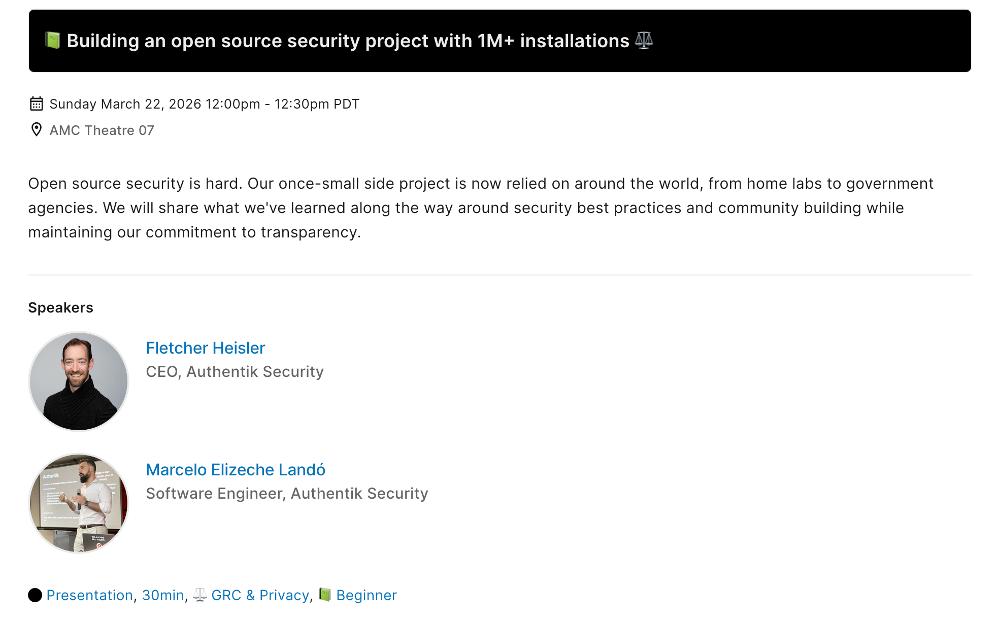 Lo que sí, a corto plazo, gracias a authentik, voy a dar una charla con Fletcher, mi jefe, en San Francisco, California, en la conferencia de seguridad BSidesSF. Está de más decir que estoy muy emocionado por eso.